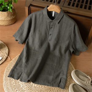 夏季純亞麻短袖襯衫男士輕薄透氣簡約薄款t卹上衣